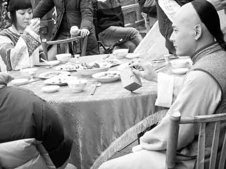 “這是我們的主菜掌上明珠!背弥膽虻目諜n,演“金寶”的英俊小生邱心志當(dāng)起了“跑堂”,給記者介紹起菜來(lái)。戲中的明爭(zhēng)暗斗都在餐桌旁,于是,這桌菜成了重要的道具。記者發(fā)現(xiàn),這些菜還是實(shí)打?qū)嵉恼娌。在這桌菜邊上一坐幾個(gè)小時(shí),還不能動(dòng)筷子,無(wú)聊時(shí),邱心志就把戲里的另一個(gè)道具——裝印章的盒子放在桌子上來(lái)回玩耍,像個(gè)雜技演員。