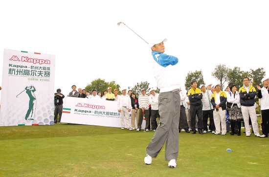 12點40分,開球儀式開始。王志文在掌聲中健步走向開球區(qū),開始了一場個人秀:站在球前,手持球桿,晃了晃身子,然后是“嗖”的一聲出手,眼睛望向遠(yuǎn)方,那姿勢是相當(dāng)標(biāo)準(zhǔn)。所有人的目光都隨著他看過去,正找球呢,突然有人喊:“咳,沒打出去!”那球還留在原地。擺譜的王志文一連虛打了兩次,才把球擊出,給人的感覺特別有范兒。王志文的球童告訴記者,王志文練球時使用金屬桿能擊出250碼,而且擊球很穩(wěn),可以看得出他是個老球手了。