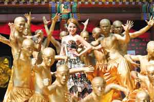 昨日的簽約地點(diǎn)選在什剎海會(huì)館,三面環(huán)水,位于白米斜街的東側(cè)(古時(shí)說(shuō)法是水為“財(cái)”,糧為“富”),祝愿與蕭亞軒合作財(cái)源廣進(jìn)。開(kāi)場(chǎng)時(shí)大屏幕首先播放蕭亞軒的歌迷們錄制的一段VCR,將貼滿(mǎn)水鉆的鳳冠,分別捧到北京的天壇、地壇、日壇、月壇四地為蕭亞軒祈福。隨后,少林寺出身的武術(shù)高手“十八銅人陣”威風(fēng)出場(chǎng),蕭亞軒喜上眉梢地從“十八銅人”中走出,寓意她將以銅墻鐵壁勇闖天下。