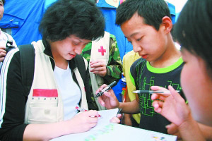 高敏昨天前往的這個(gè)小學(xué),是從北川撤到綿陽(yáng)的。她負(fù)責(zé)的這個(gè)班是一個(gè)五年級(jí)的班,有三十四個(gè)孩子!拔易哌M(jìn)帳篷,看到孩子們就在這個(gè)不是很大的帳篷中挨挨擠擠地上課。條件非常艱苦,但每個(gè)孩子都非常認(rèn)真!备呙魟(dòng)情地說(shuō),“孩子們都不大認(rèn)識(shí)我,我也不認(rèn)識(shí)他們。所以我首先就安排了一個(gè)自我介紹的環(huán)節(jié)!备呙舻倪@個(gè)“自我介紹環(huán)節(jié)”非常有意思,就是一邊介紹自己的名字,一邊用一個(gè)形象的動(dòng)作表示自己名字的意思。“我叫高敏,就是高度過(guò)敏。”說(shuō)罷,高敏笑著撓撓自己身上的這里,撓撓自己身上的那里,然后讓每個(gè)孩子都如法炮制!坝械暮⒆用种杏幸粋(gè)‘強(qiáng)’字,他就挽起自己的袖子,露出小胳膊,鼓起肌肉;有的孩子名字當(dāng)中有一個(gè)‘靜’字,她就笑著閉上眼睛,做出一個(gè)睡覺(jué)的樣子;有的孩子名字中有一個(gè)‘花’字,她就扮成一朵美麗的花的樣子。”高敏動(dòng)情地說(shuō),“當(dāng)每個(gè)孩子說(shuō)完一遍之后,我真的感覺(jué)到他們?cè)跒樗麄冏约旱拿指械津湴。?/p>