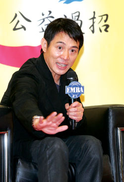 中新網(wǎng)6月3日電 據(jù)臺(tái)灣“東森新聞”報(bào)道,功夫巨星李連杰這次到臺(tái)灣不宣傳電影,他推廣的是一元行善;2日晚間他走進(jìn)政大EMBA講堂,在臺(tái)灣的企業(yè)精英和教授面前,足足說(shuō)了兩個(gè)小時(shí),而且他有問必答,風(fēng)趣的言談成功的把一元行善的想法,介紹給在場(chǎng)的政大師生。