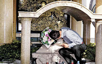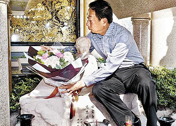昨天下午4時,身著長袖襯衫搭配西裝褲的郭臺銘搭乘奔馳車出現,進入墓園后,郭臺銘神情肅穆,開始打理祭拜亡妻的儀式。他將一大束鮮花小心翼翼地放在愛妻雕像邊,并在墓前擺上愛妻生前愛吃的四季豆干面和涼拌小黃瓜,一切擺妥,他溫和地請記者退開些,讓他有機會和愛妻獨處。