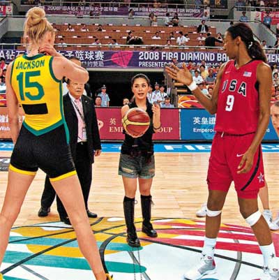 一身黑色打扮的阿嬌,昨晚在浙江為美國對澳大利亞的籃球決賽主持開球禮。