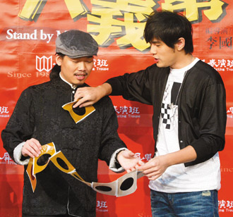 中新網(wǎng)9月3日電 創(chuàng)作才子方文山首度跨足舞臺(tái)劇演出屏風(fēng)表演班新戲“六義幫”,10月3日上演在即,好友周杰倫不但近來(lái)在辦公室常熱心陪著好友對(duì)稿、彩排,昨天還帶著“狗皮膏藥”探班。