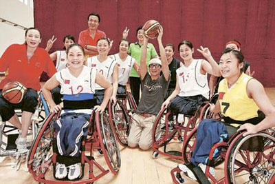 劉德華為輪椅女籃球隊(duì)隊(duì)員打氣。