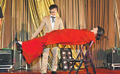 周杰倫(后)玩魔術(shù),昨在婚宴上將新娘子飄浮半空中。