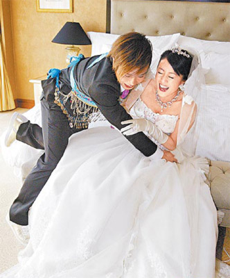據(jù)臺(tái)灣媒體報(bào)道,彈頭與皮皮交往半年就閃電步入禮堂,外傳是奉子成婚,昨晚新娘穿著馬甲式白紗、腳踩高跟鞋性感亮相,刻意“藏”住孕味。他們昨一早在飯店總統(tǒng)套房進(jìn)行迎娶,彈頭為見(jiàn)到新娘一面,必須過(guò)3關(guān),包括通過(guò)“老漢推車”、“火車便當(dāng)”等體能測(cè)驗(yàn),同時(shí)吃下他最怕的海參沾黃連,再涂口紅蓋唇印,對(duì)新娘說(shuō)愛(ài)的宣言。拜別父母時(shí),新郎卻哭得比新娘還慘。