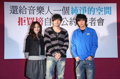 臨時(shí)知道要出席這個(gè)活動(dòng)的周杰倫,雖然抱病也堅(jiān)持到場(chǎng),他在記者會(huì)上再次呼吁大家給音樂(lè)一個(gè)誠(chéng)實(shí)的空間,這樣才能激勵(lì)藝人做出最好的音樂(lè)。他說(shuō),以前的唱片隨隨便便就能賣到二三十萬(wàn)張,但近些年來(lái)唱片業(yè)一直下滑。眾所周知,盜版和買榜是唱片業(yè)的兩大心魔,大家要一起努力,還給音樂(lè)一個(gè)純凈空間。他還風(fēng)趣地說(shuō),有錢不用買榜,可以去買車。而新力音樂(lè)旗下藝人王力宏由于昨日凌晨突發(fā)急性腸胃炎無(wú)法到場(chǎng),他委托公司的大中華區(qū)總裁崔震東代發(fā)聲明,表示娛樂(lè)圈的良性競(jìng)爭(zhēng)是好事,不應(yīng)該用買榜這種不誠(chéng)實(shí)的方式,“我的唱片公司在(去年)12月31日告訴我,唱片圈買榜風(fēng)氣盛行,新力音樂(lè)決定不買榜,公司要我有心理準(zhǔn)備,這次的專輯雖然是銷售冠軍,但不會(huì)是排行榜的第一名。我當(dāng)時(shí)告訴公司,我支持公司不買榜的行動(dòng)!庇浾 李懿
