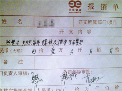 這份報(bào)銷單中,開(kāi)支內(nèi)容一欄寫(xiě)的是“陳楚生失蹤事件媒體及博客寫(xiě)手費(fèi)用”,部門(mén)負(fù)責(zé)人審核一欄簽有天娛傳媒宣傳總監(jiān)吳夢(mèng)知的名字,公司領(lǐng)導(dǎo)審批則有天娛總經(jīng)理龍丹妮和天娛副總楊柳的簽名。
