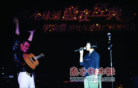 張艾嘉的出現(xiàn)令觀眾極為興奮。這個(gè)被李宗盛稱(chēng)為“大姐”的女人一上臺(tái)就調(diào)侃李宗盛:“在歌壇里,小李是我的最?lèi)?ài),那你的最?lèi)?ài)是誰(shuí)?”讓李宗盛無(wú)言以對(duì)。她唱起了《我這樣愛(ài)你到底對(duì)不對(duì)》、《因?yàn)榧拍,還不忘輕松地在舞臺(tái)上表現(xiàn)兩個(gè)人的友情:“你們看過(guò)小李演的電影沒(méi)有?他演的多數(shù)是喜劇,悲劇也能演成喜劇,每次都演我的丈夫或者男朋友,唉,我真的很不幸……”此外她還逼問(wèn):“你的歌都很浪漫,不知道你是不是一個(gè)浪漫的男人?”李宗盛據(jù)實(shí)以答:“把渴望而不可得的寫(xiě)入歌中,我的實(shí)際人生很沉悶的!睆埌巫詈蠛鼙挤诺貏裾f(shuō)他:“再找個(gè)好點(diǎn)的,再生個(gè)妞。”記者 齊帥 攝影 馬強(qiáng)