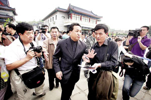9點(diǎn)10分左右,常寶華、劉惠等人紛紛從側(cè)門離開,被群眾和媒體以包夾之勢(shì)分別圍住。