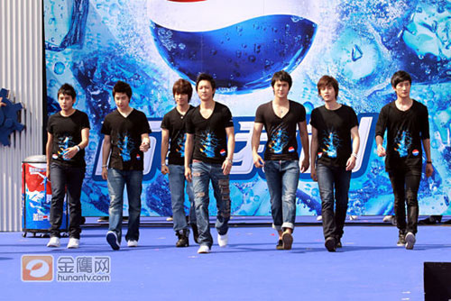 新加盟成員SJ-M先聲奪人,如古代騎士般在塔樓尖上出現(xiàn)的他們立刻引起了在場歌迷的陣陣尖叫。而后古天樂、蔡依林、李準(zhǔn)基、羅志祥、黃曉明在印有該品牌標(biāo)識的大卡車頂緩緩出現(xiàn),12位成員當(dāng)場在臺(tái)上互相潑水取樂,宛如畫面。