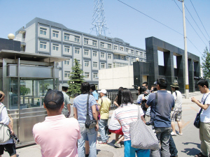 2日晚10時(shí),在朝陽(yáng)北路北京市公安局朝陽(yáng)分局看守所和拘留所的大院門(mén)外的輔路上,已經(jīng)停滿了新聞?dòng)浾叩能?chē)輛,30余名記者手持照相機(jī)或攝像機(jī)已經(jīng)在門(mén)外苦苦等候。昨日早晨7時(shí),陸續(xù)又有數(shù)名記者趕到朝陽(yáng)看守所大門(mén)口參與蹲守。