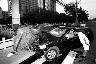 前天凌晨,一輛無牌照黑色R300型奔馳在朝陽區(qū)高碑店北路,將“新月”出租車頂在電線桿上,出租車身被擠變形,奔馳車前臉損壞,車內(nèi)氣囊彈出。該事故造成出租車內(nèi)三人受傷,乘客小劉的肋骨和腳踝均有骨折,乘客小王的耳朵縫了3針,另有多處劃傷,出租車司機(jī)頭部、肺部受傷。