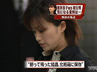 中新網(wǎng)10月26日電 被控違反《興奮劑取締法》持有、使用毒品的日本女星酒井法子(38歲,本名高相法子)首次公審26日在東京地方法院(審判長:村山浩昭)進行。酒井在法庭上對起訴內(nèi)容供認(rèn)不諱。檢方求刑1年零6個月,判決計劃將于11月9日下達。