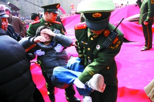 開機大典在一片鑼鼓和禮炮聲中拉開序幕。當?shù)氐臄?shù)千名圍觀群眾剛開始還秩序井然,多數(shù)在遠處旁觀。但是,隨著眾主創(chuàng)的陸續(xù)登臺亮相,人群中開始騷動起來。盡管現(xiàn)場有人數(shù)頗多的保安維持秩序,但是都保護著明星和領導,并沒有安排專人負責媒體席,令300多位群眾瞬間涌上原本只能容納百人的一米多高的簡易媒體臺。