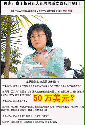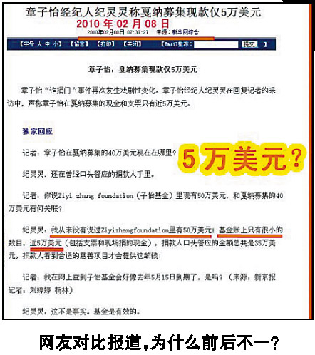 籌款之時見諸報端的善款數(shù)字,與網(wǎng)友各處追查而得的結(jié)果相差甚遠,有人認定章子怡中飽私囊,打著慈善的名號謀利。章子怡究竟募集了多少善款?700萬美元?200萬美元?100萬美元?50萬美元?章子怡說,在戛納募捐現(xiàn)場籌集到的現(xiàn)金實際只有1392.36美元。