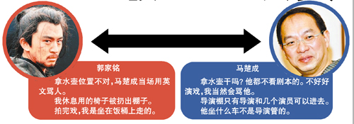 馬楚成說(shuō):“我對(duì)郭家銘是有意見。我是很少罵人的導(dǎo)演,為什么我罵了他?為什么片場(chǎng)的化妝、梳頭這些工作人員都不喜歡他?我覺得他應(yīng)該檢討一下自己。他的戲演得不好,我讓他演一場(chǎng)醉酒的戲,開拍之前他喝了很多酒,正式拍的時(shí)候他竟然醉到了沒法拍的地步,要第二天重拍。他們那邊又說(shuō)第二天不行,他要去云南拍一個(gè)電視劇。我很生氣,因?yàn)樗麄冞M(jìn)組前告訴我說(shuō)已經(jīng)推掉了云南那個(gè)戲,怎么能刻意騙人呢?搞得我們的戲卡在那里。再說(shuō)他拿著水壺的那場(chǎng)戲,他都不看劇本的,大家都沒水喝了,他拿那么大壺水干嗎?自己不好好演戲,我當(dāng)然會(huì)罵他啦。我讓他演戲不要那么夸張,他不聽,當(dāng)自己大牌,那我就只好刪他的戲了。他還不斷地問(wèn)我為什么不拍他的特寫,這部戲叫做《花木蘭》哦,每個(gè)群眾演員、每個(gè)小角色都給很多特寫,這戲還怎么演?”