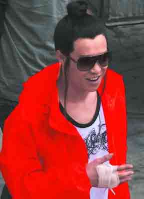 小沈陽(yáng)穿著一件鮮亮的橙色外套,里面是一件隨意的白色T恤,臉上已經(jīng)化好妝,戴著墨鏡,而不是大家常見(jiàn)的黑框眼鏡,乍一看還真有點(diǎn)認(rèn)不出來(lái)。小沈陽(yáng)的古裝頭套已經(jīng)戴好,只是一個(gè)簡(jiǎn)單朝上梳的發(fā)髻,不過(guò)鬢角兩側(cè)還特地留了兩縷長(zhǎng)長(zhǎng)的頭發(fā)。記者一眼就發(fā)現(xiàn),小沈陽(yáng)的右手不自然地舉在小腹前,還用白色的紗布進(jìn)行了包扎,肯定是受傷了。不過(guò)小沈陽(yáng)的心情看上去好極了,他先是哼歌,后來(lái)見(jiàn)記者追問(wèn)拍戲感受,他便取下墨鏡,反問(wèn)記者是哪里人,不過(guò)面對(duì)“第一次和張導(dǎo)拍戲的感覺(jué)怎么樣”的問(wèn)題,小沈陽(yáng)只是微笑,并不回答。