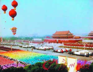我覺得自己很是神氣,因為我站在第一排,手里的花環(huán)是亮麗的紅色。整整一個暑假,我們在學校的操場、在機場的停機坪上、甚至在天安門廣場演練,走正步喊口號,有節(jié)奏地揮舞花環(huán)。