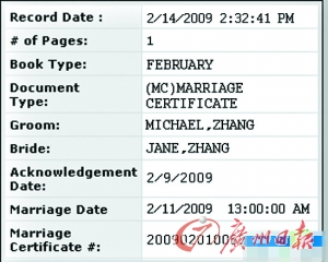 有媒體爆料,在美國(guó)新澤西州網(wǎng)站發(fā)布的結(jié)婚登記信息顯示,張靚穎已與英文名“MICHAEL ZHANG”的男子注冊(cè)結(jié)婚。這位神秘男友邁克的真實(shí)身份,流傳了兩個(gè)版本。一是張靚穎合作多年的經(jīng)紀(jì)人馮科,但馮科的真實(shí)英文名“MICHAEL FENG”,與登記的信息有一些出入。二是這位“MICHAEL ZHANG”是位富二代,中文名張海濤自小隨做服裝貿(mào)易生意的父母移居美國(guó),家族身家數(shù)十億,也是精通20多種樂(lè)器的“音樂(lè)狂才”。有人爆是在某國(guó)際音樂(lè)節(jié)上,經(jīng)譚盾介紹,張靚穎認(rèn)識(shí)了這位富二代,而該男友更暗地幫助張靚穎主攻虎年央視春晚。兩人更在今年情人節(jié)在美國(guó)新澤西州登記結(jié)婚。