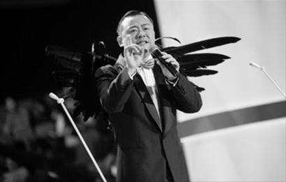 當(dāng)晚,周立波一身筆挺修身的黑西裝在舞臺(tái)上亮相,只不過(guò)背后“長(zhǎng)”出了一雙黑色的羽毛翅膀,最搞笑的是,他居然提了個(gè)小板凳,然后直挺挺地站了上去,因?yàn)樗車(chē)拿琅畟(gè)頭都比他高!拔医裉斓脑煨推鋵(shí)是個(gè)天使,但很多人說(shuō)我像只烏鴉,但你們別把烏鴉不當(dāng)鳥(niǎo),別把饅頭不當(dāng)點(diǎn)心!”