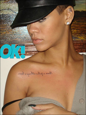 美國(guó)歌壇數(shù)一數(shù)二的潮流小天后蕾哈娜在自曝自己的手槍紋身后,再度在自己的博客中登出了全新的紋身!癗ever A Failure, Always A Lesson”這就是這位小天后在自己的鎖骨處的新紋身上面的一句話?不知道蕾哈娜想要告訴我們什么呢?