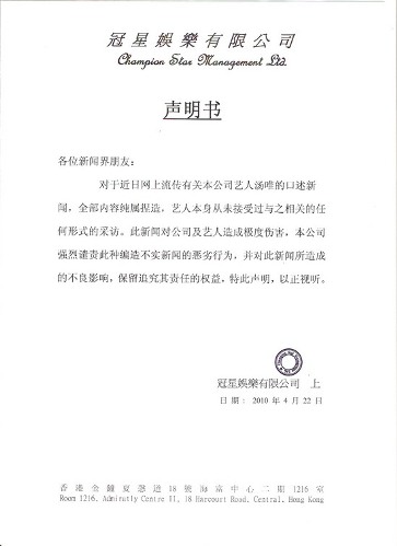 對于近日網(wǎng)上流傳有關(guān)本公司藝人湯唯的口述新聞,全部內(nèi)容純屬捏造,藝人本身從未接受過與之相關(guān)的任何形式的采訪。此新聞對公司及藝人造成極度傷害,本公司強烈譴責此種編造不實新聞的惡劣行為,并對此新聞造成的不良影響,保留追究其責任的權(quán)益,特此聲明,以正視聽。