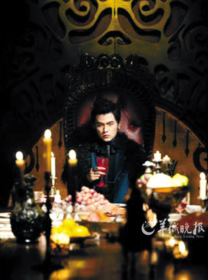 在新專輯預(yù)售海報(bào)上,周杰倫以一個(gè)中古世紀(jì)的吸血鬼扮相出現(xiàn)。只見他臉色蒼白,嘴唇鮮紅,穿一身西裝外套,還罩了一件羽毛披肩,坐在餐桌前若有所思,像是一個(gè)住在城堡中的神秘“吸血鬼王子”。造型師還在周杰倫的指甲貼上帶有鉚釘?shù)闹讣灼,讓握著酒杯的手流露出華麗感;眼睛里則戴上了特殊的隱形眼鏡,營造出一雙“電眼”,眼里還有動物般的直立橢圓瞳孔,詭異得令人戰(zhàn)栗。