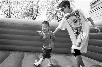 “平時真沒時間這么陪他玩,今天(2日)是他的生日,怎么也得好好陪陪他!睂O悅喘著氣說。她剛把水槍放下,小儒生又跑了過來,拉著她上氣墊床上玩。