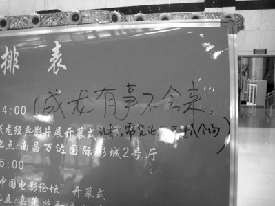 但有趣的是,記者們?cè)陔娪肮?jié)“指定酒店”的大堂信息欄發(fā)現(xiàn)了這樣一行大字:“成龍有事不會(huì)來(lái)。 ”記者們看后紛紛大笑,并用相機(jī)拍下了這個(gè)有意思的畫(huà)面,這句話(huà)也迅速成為記者圈內(nèi)的一句流行語(yǔ)。記者 于音