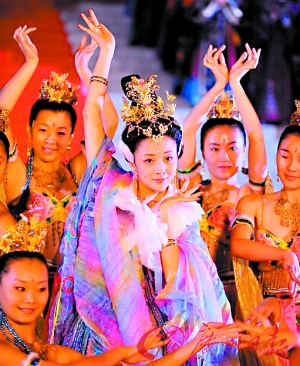 在《楊貴妃秘史》的拍攝基地,記者們首次看到了該劇剛剛制作完成的40分鐘片段。在片花中,演員們?nèi)A麗的服飾十分搶眼,“霓裳羽衣舞”也得到了完整展示,尤小剛表示,片中的舞蹈段落非常多,全劇拍攝的4個月中,舞蹈團隊就跟了三個半月,“大家都以為拍古裝戲,打仗的場面最難拍,其實不然。拍攝這部劇最難的是在復原很多鮮為人知的唐朝文化細節(jié)。觀眾在這部劇中可以看到數(shù)百人組成的唐代宮廷樂隊,黃秋生扮演的李隆基也表演了好幾段舞蹈。”