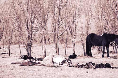記者6日來到拍攝現(xiàn)場(chǎng),發(fā)現(xiàn)一大片平整的濕地上異常熱鬧,十多匹高頭大馬正在不停地啃著野生紅柳的樹皮,約30多臺(tái)各種車輛停放在濕地上,地上到處是垃圾和隨手扔掉的黑白塑料袋……