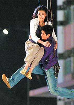 為了吊鋼絲的驚險(xiǎn)戲碼,電影公司貼心為城城、舒淇安排替身,但2人大部分仍敬業(yè)親自上陣,為求安全,拍攝前都戴上護(hù)具做好安全措施,并試戲2、3次才正式開拍,過程大都安全順利。