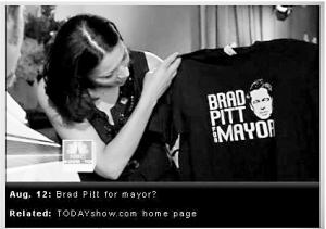 現(xiàn)在,市長競選的宣傳工作已經(jīng)啟動,除了競選徽章出爐,還有許多市民從7月份開始身穿印有“Brad Pitt for Mayor(選布拉德·皮特當市長)”字樣的T恤。該T恤在當?shù)刭u到20美元一件。