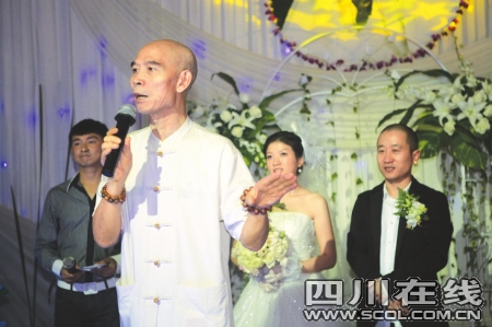 12點09分,婚禮正式開始,巴蜀笑星叮當和朱軍聯(lián)袂主持。在6個“花仙子”的迎接下,李彧挽著陳燕琳,踏上紅色地毯,整個婚禮過程與傳統(tǒng)婚禮并沒有太大差別。叮當宣布:“有請李伯清主婚登臺!”臺下300人立即爆出掌聲一片。李伯清登臺,依舊是他那詼諧、幽默的風格,面對觀眾妙語如珠,他說:“之所以由我主婚,是因為李保田幾年前在成都拍攝《王保長新篇》,他用了我的許多學生,演了很多角色。還教育我的學生怎樣做人。今天他兒子娶了四川姑娘,這就是說,李保田一家人,看得起我們四川人!”李伯清主婚,不改插科打諢的特長。宣稱自己就是李彧和陳燕琳的父母,將來有什么事找他就是了,引來現(xiàn)場笑聲不斷。