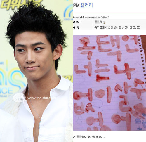 “朝鮮日?qǐng)?bào)”消息,上月28日在社交網(wǎng)站DCInside的2PM圖庫中,一名會(huì)員上傳了寫有“玉澤演你沒有我就活不了”的血書。一些網(wǎng)民看到后懷疑“是不是用紅墨水寫的假血書?”對(duì)此,上傳這份血書的粉絲表示“我說到做到”,并公開了染血的內(nèi)衣。