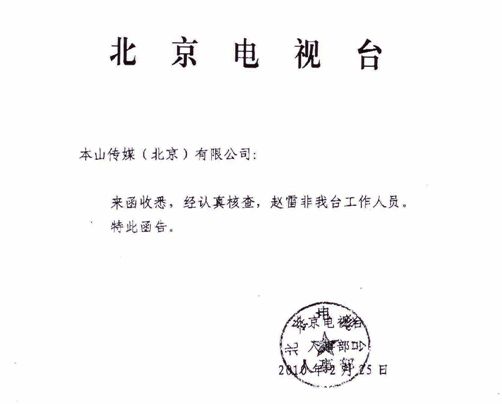 近日,在網(wǎng)上出現(xiàn)了一條消息,作者自稱是北京電視臺導(dǎo)演趙雷。消息稱趙本山在央視春晚演完《捐助》后,因?yàn)樾∩蜿栍袃蓚(gè)廣告包袱沒抖出來,在后臺打了小沈陽兩記耳光。對此,本山傳媒鄭重聲明,這條消息純屬捏造。另外,本山傳媒已致函北京電視臺人事部,了解趙雷的身份。北京電視臺人事部回函聲明,趙雷不是北京電視臺工作人員。