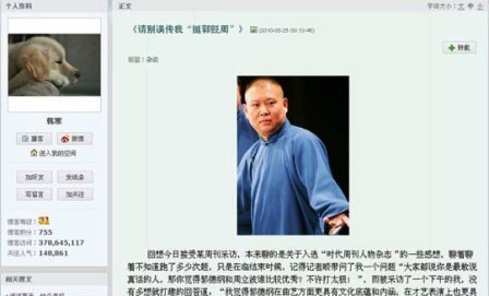 記者根據(jù)網(wǎng)友所曝光的內(nèi)容了解到,此次韓寒發(fā)文的動(dòng)機(jī)是源于近日的一次采訪(fǎng),某周刊雜志記者問(wèn)韓寒“大家都說(shuō)你是最敢說(shuō)真話(huà)的人,那你覺(jué)得郭德綱和周立波誰(shuí)比較優(yōu)秀?不許打太極!”韓寒當(dāng)時(shí)回答道:“我覺(jué)得郭德綱在曲藝方面更具有文化底蘊(yùn)和內(nèi)涵,在才藝表演上也更具文化優(yōu)勢(shì),但是從娛樂(lè)人民的實(shí)用角度上看,周立波和郭德綱難分伯仲!倍潞箜n寒擔(dān)心這個(gè)采訪(fǎng)會(huì)給記者產(chǎn)生斷章取義的“誤解”,造成“挺郭貶周”的爭(zhēng)議,于是當(dāng)晚趕在這篇采訪(fǎng)見(jiàn)稿前,先發(fā)制人地在自己的博客撰文《請(qǐng)別誤傳我“挺郭貶周”》,詳細(xì)澄清對(duì)郭德綱和周立波的個(gè)人見(jiàn)解。