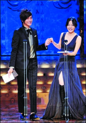 當天,獲獎的韓劇只有獲得“最優(yōu)秀青少年電視劇獎”的《jungle_fish》與獲得“優(yōu)秀短篇獎”的《黃金新娘》,雖然有韓星柳真和崔秀鐘擔(dān)任司儀,東方神起任表演嘉賓,還有獲得“最受歡迎男、女演員”的李準基和南相美出席,但是中國明星的魅力絕對難以抵擋。蔡琳當天以低V長裙配高筒靴的造型出現(xiàn),和小綜一起頒發(fā)“最佳男、女演員獎”,小綜對蔡琳贊不絕口,還頻頻表示自己被電暈了,哄得蔡琳十分開心。而且小綜還不時用半咸淡韓語和臺下粉絲打招呼,引得粉絲們陣陣歡呼,大喊偶像的名字。