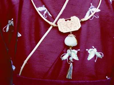 黛玉著綠,寶釵穿白,近距離打量,大概是拍了大半年了的緣故,衣服都有些舊了。寶玉胸口那塊通靈寶玉據(jù)說(shuō)是很貴的,于小彤介紹說(shuō)是羊脂玉,仔細(xì)打量,上面居然還刻著“通靈寶玉”四個(gè)字,頓時(shí)把我看傻了:不是應(yīng)該刻“莫失莫忘,仙壽恒昌”嗎?