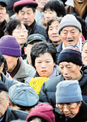 上午九點(diǎn)左右,沒有哀怨的哀樂,孫道臨追悼會(huì)在一種平和安詳?shù)臍夥罩羞M(jìn)行。孫道臨的妻子王文娟以及他們的兒女和孫子女靜靜地站在靈堂一角,淚流滿面,面容悲慟。九點(diǎn)一刻左右,群眾吊唁儀式開始,等候多時(shí)的群眾手持鮮花,井然有序地排隊(duì)進(jìn)場。追悼會(huì)于上午十點(diǎn)半左右結(jié)束,一個(gè)半小時(shí)的時(shí)間內(nèi),前來吊唁的群眾將近萬人。