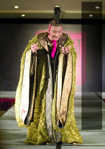 陳佩斯身穿金黃色龍袍在T臺(tái)上大作秀,“阿斗”的服裝是雙面設(shè)計(jì),被陳佩斯稱(chēng)為節(jié)約的龍袍。