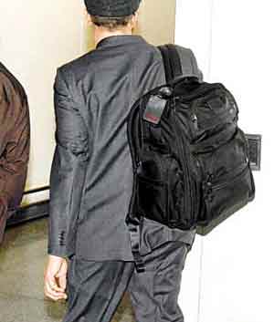 萊昂納多戴上黑色帽、身穿黑色西裝,背一個(gè)黑色背囊,急步離開。