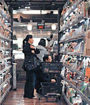 伏明霞產(chǎn)后變身家庭主婦,梁錦松蹲在地上幫老婆挑選商品。