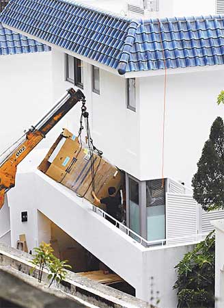 去年底劉嘉玲位于香港山頂新居,用吊車把冰箱送入宅。