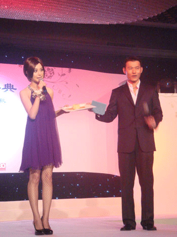 當晚,女星范冰冰著一身紫色露背晚裝壓軸登場。范冰冰稱自己此次設(shè)計的冰淇淋月餅是特意為奧運健兒劉翔所做。她說,劉翔的名字里有個“翔”,所以在這個冰淇淋月餅原有的基礎(chǔ)上加了一對翅膀,希望這個跑得最快的天使,在今年北京奧運會上能再次奪冠,也祝福所有正在為奧運正在忙碌的人們。