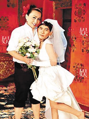 有網(wǎng)友就把兩人的結(jié)婚照惡搞一番。其中在不丹王宮拍攝的一幅,慘被網(wǎng)友變性,偉仔身穿婚紗依偎新娘,嘉玲則很新郎地?cái)堉鴮Ψ健?