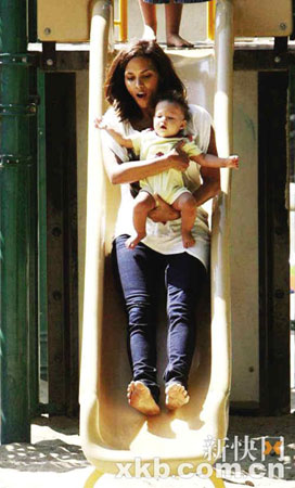 哈里·貝瑞陪女兒玩滑梯享天倫之樂(圖)