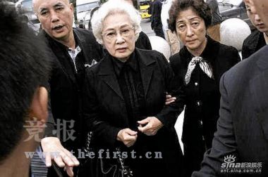 大廳內(nèi)的墻上掛著謝導(dǎo)的遺像,謝晉的遺體邊遍布鮮花,老人戴著眼鏡,就好像睡著了一般,旁邊還放著他最鐘愛的一頂帽子。一點(diǎn)十分左右,謝晉妻子徐大雯和其小兒子阿四到達(dá)追悼會(huì)現(xiàn)場(chǎng),強(qiáng)掩住內(nèi)心的悲傷,送謝導(dǎo)最后一程。這幾天,徐大雯堅(jiān)持從醫(yī)院出來,親自參與布置靈堂,盡管她剛剛安裝了心臟起搏器,精神狀態(tài)很不好。徐大雯這些天說得最多話是:“我不能倒,這個(gè)家總得有一個(gè)人撐著!弊蛉,一直表現(xiàn)堅(jiān)強(qiáng)的徐大雯顯得非常憔悴,頭發(fā)花白,走路蹣跚,對(duì)著謝晉的遺體說了不少話。